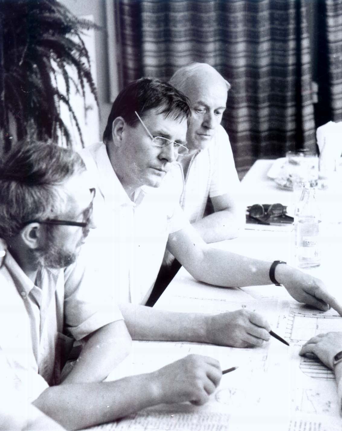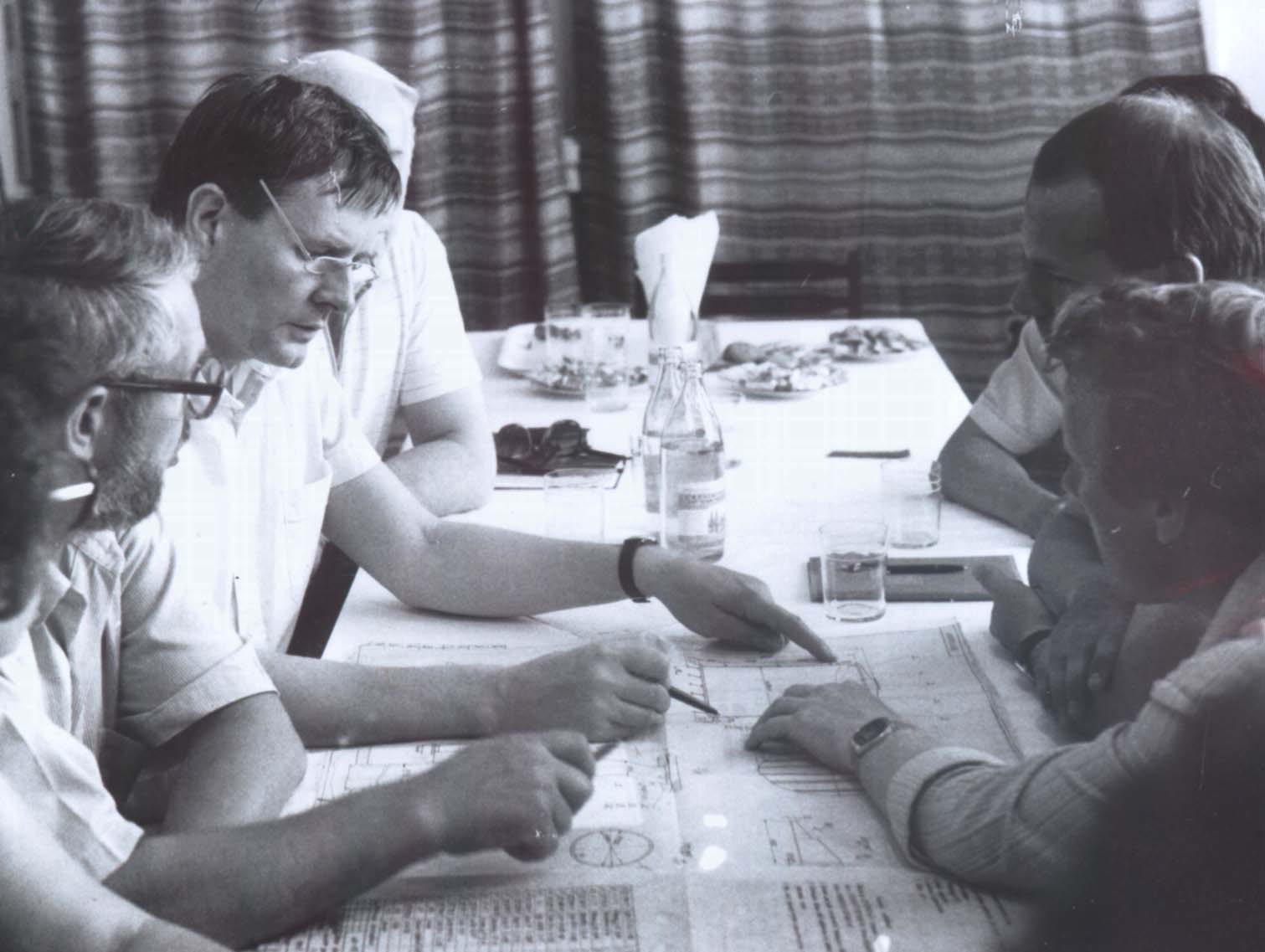 Projektendkontrolle zum Lizenzvorhaben "Reines Natriumhypophosphit auf Phosphorschlamm-Basis", Kombinat "CHIMPROM", Dshambul, Kasachstan. D. Zobel (Mitte links) als Leiter des Projekt- und Anfahrstabes (Dshambul, 11. Oktober 1989)